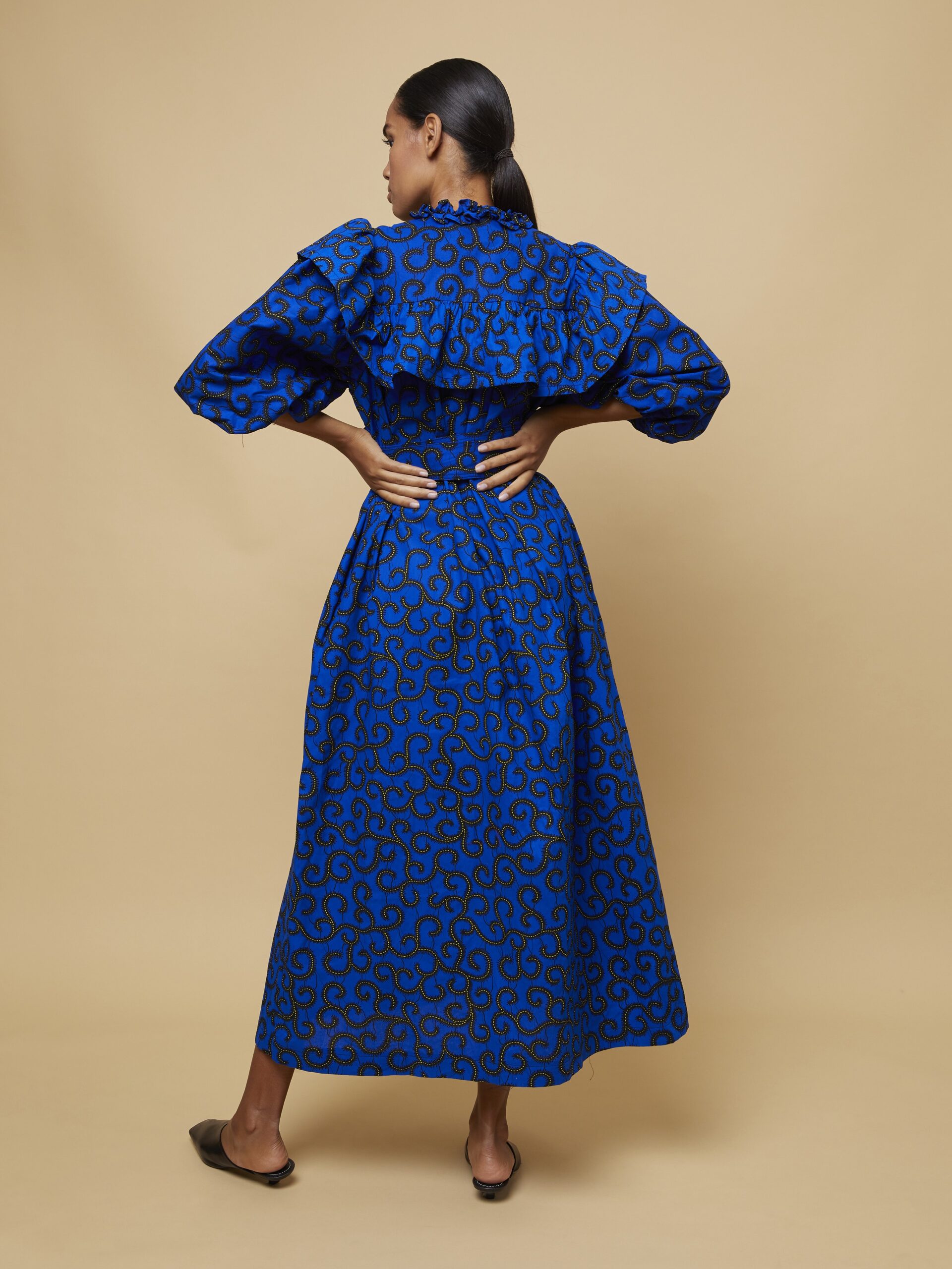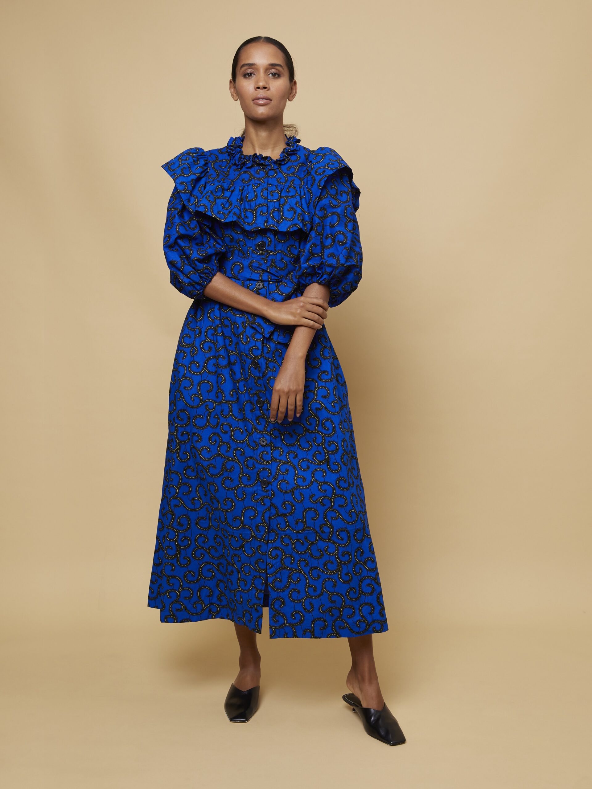 This long dress with buttons, puffer sleeves and fringes creates a silhouette that juxtapose traditional and modern in a new chic way.